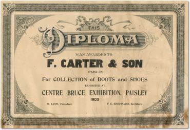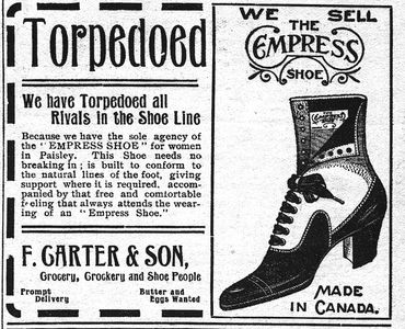 In those days salesmen came to Paisley by train and set up sample rooms at the Balmoral Hotel " (recently G & M Variety). "Dishes came packed in wicker baskets and shoes in suitcases. Items such as oysters and pickles were sold from barrels which had glass lids, domed high as on old comports. Pickles were dipped from the pungent brine and poured into wire handled cardboard pails with a glass ladle. Both creamery and farm butter were stocked, and each fall Mr. Carter would drive to the 4th of Elderslie and bring home a wagonload of new cheese from the Cantire Cheese Factory. Stored in the basement until aged, it was then brought into the store and placed under a glass dome on the cheese table. Raw bacon, ham, tenderloin and pork hocks were ordered weekly in the cold weather from Coleman's Plant in Kincardine, and this meat was generally ordered in advance by customers. Only on special occasions were lettuce and tomatoes brought in, out of season, and only at Christmas time were oranges available. Molly recalls that these Christmas oranges were huge and cost a nickel each. Her father used to take them as treats for the children when he went visiting.